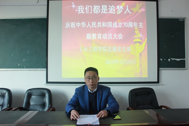 为迎接中华人民共和国成立70周年,引领广大青年学子深入学习贯彻习近平新时代中国特色社会主义思想,深切感受70年来我国建设发展的巨大变化,全面展示新时代大学生的理想信念,青春风采和积极奋进的精神风貌,3月20日,齐齐哈尔城市建设学院直属党支部在D栋401会议室召开了“我们都是追梦人”主题教育活动启动仪式。参加会议的有全体班主任辅导员和各班班长、团支部书记、宣传委员。启动仪式由学校党支部副书记刘永东主持。