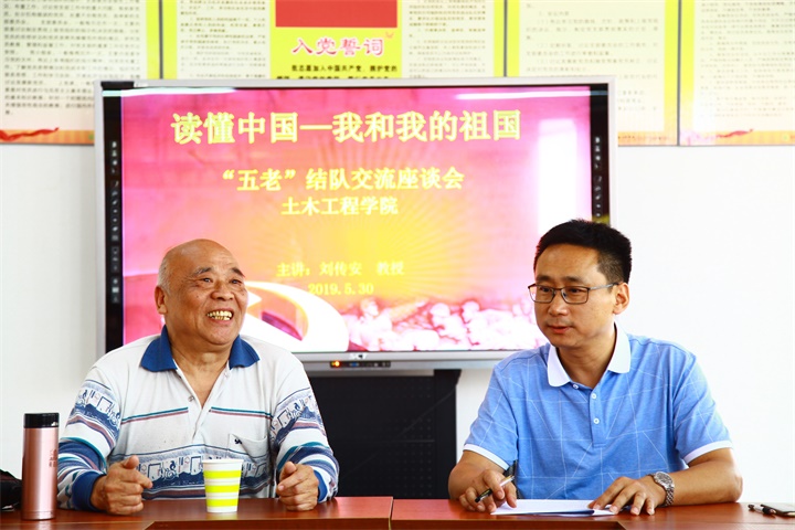 为深入贯彻落实习近平新时代中国特色社会主义思想和习近平总书记关于教育工作及关心下一代工作的重要论述,进一步深化和拓展关爱服务青年学生成长成才,齐齐哈尔城市建设学院直属党支部于5月30日下午在D栋500开展以“我和我的祖国”为主题的“读懂中国”系列活动之“五老”结队交流座谈会,座谈会邀请刘传安教授参加。